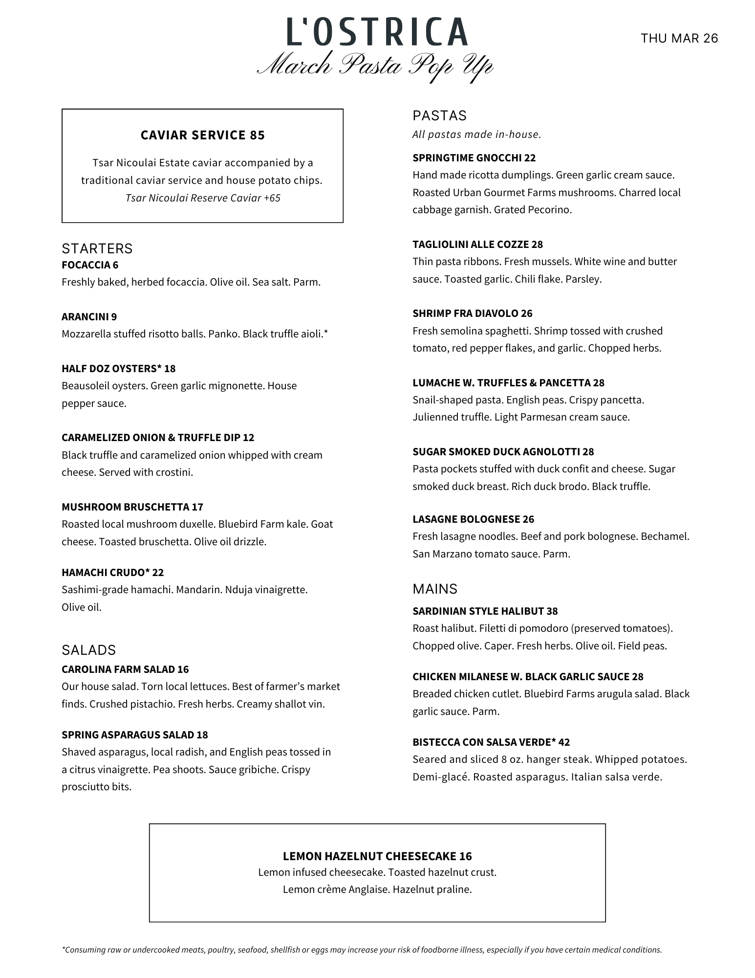 Our Pasta Pop Up returns on Thursday, March 26. This month’s pop up menu has some familiar favorites but has also been refreshed for spring. Visit Tock for reservations.